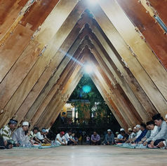 こうした状況を受けて、避難キャンプのすぐ横にパル コミュニティセンターの建設が計画されました。特徴的な三角の形は、この地の伝統的な住宅 Rumah Tambi に着想を得ています。合板は同じスラウェシ島で現地の職人によってプレカットされ、施工には地元の人々やバンドン工科大学、タデュラコ大学の建築学生らが参加しました。
